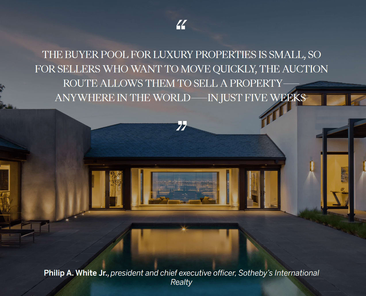 “Our partnership with Sotheby’s Concierge Auctions is a great benefit for our clients,” says Philip A. White Jr., president and chief executive officer, Sotheby’s International Realty. “The buyer pool for luxury properties is small, so for sellers who want to move quickly, the auction route allows them to sell a property—anywhere in the world—in just five weeks. Using this approach, we can target buyers who have the means and interest in luxury properties, enabling them to achieve fair market value.”