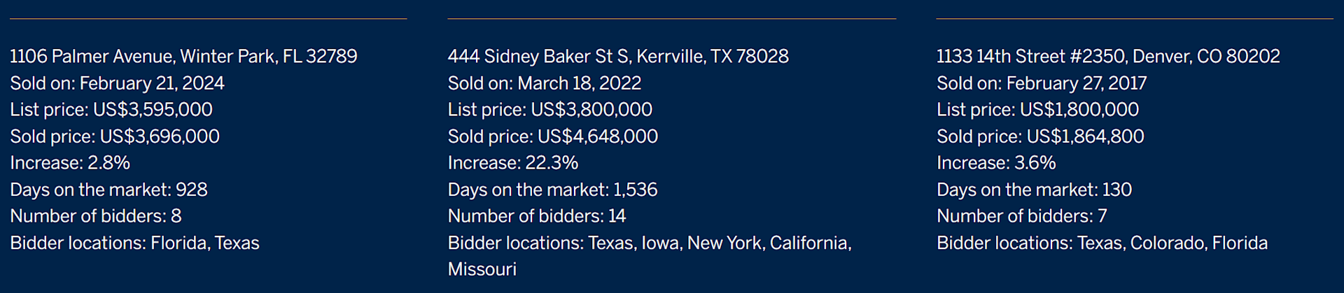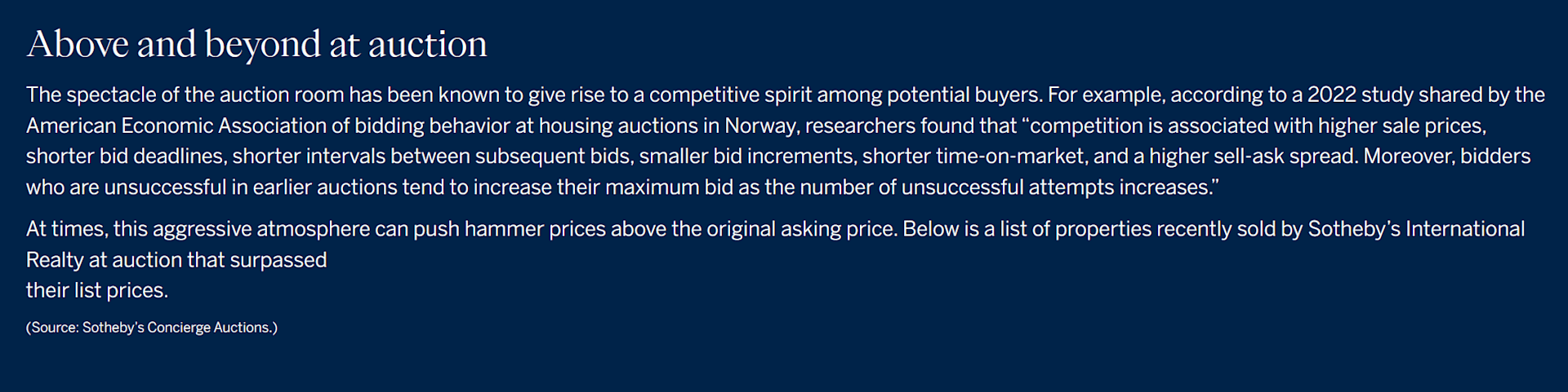 As part of the auction process, over a period of 35 days, Sotheby’s Concierge Auctions usually fields nearly 500 inquiries per home listed for auction. This number is quickly winnowed down, and after 25-50 in-person visits to the property, each lot ends up with five to seven bidders, on average.