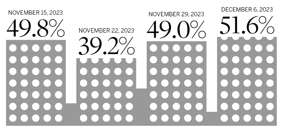 According to data from property technology and security firm Kastle Systems, whose Back to Work Barometer tracks access to offices in top U.S. metro areas, occupancy hovered around 50% in September 2023.