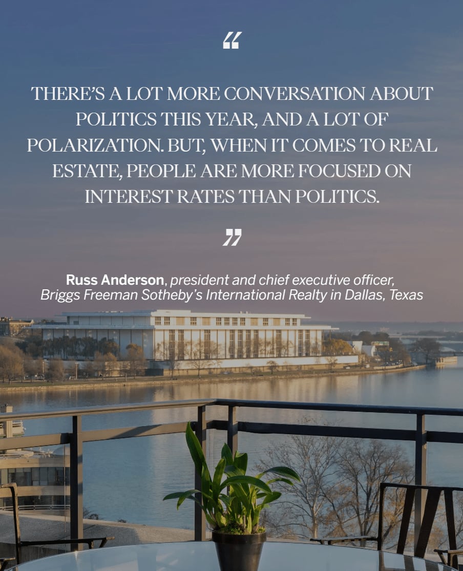 The U.S. 2024 presidential election represents a critical moment for investors and financial analysts around the world—with the potential to have an impact on several areas, from economic policies to specific markets, the outcome could shape the global economic future,” says Renata Victorino, director, Bossa Nova Sotheby’s International Realty in São Paulo, Brazil. Victorino and her colleagues in South America are keeping a keen eye on what is happening in the U.S., even as municipal elections take place in Brazil in October 2024 to decide the leaders in more than 5,000 cities and towns across the country. Meanwhile, in other areas of the world, India—the largest nation by population—started its massive six-week election process in April 2024 and voting for the parliament of the 27-member European Union took place in June 2024.These events could have a dramatic effect on real estate markets for years to come, with the outcomes already playing out in countries that held elections in the first half of 2024, and the anticipation of changes in the political landscape felt in countries that have yet to hit the polls.