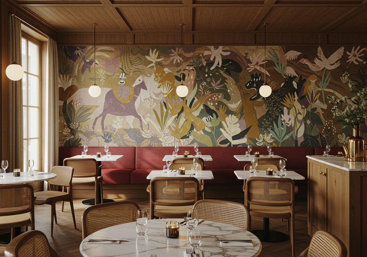 Michelin-starred chef Raphael Rego’s Oka restaurant—which translates to “house” in Brazil’s Indigenous Tupi language—has moved to the 17th arrondissement, and is now paired with a sister restaurant, Fogo, meaning “fire.” The kitchen sits between the two, serving food that mixes Brazilian and French influences, accompanied by a list of more than 5,000 wines. The sophisticated space is designed by architect Arnaud Behzadi, with hand-painted murals by the artist Florence Bamberger.