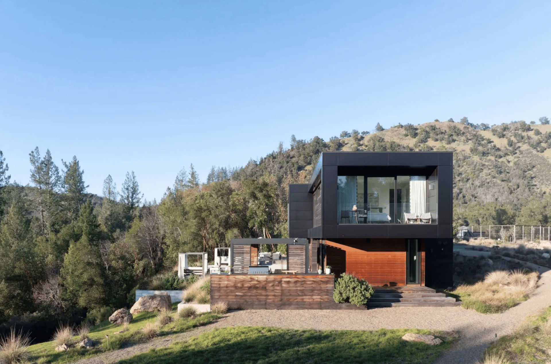 At a modern sanctuary in Calistoga, California, designed by Signum Architecture, both shou sugi ban—an ancient Japanese timber-charring technique—and stained cedar have been used to create an exterior cladding that offers natural resistance to fire and insects. Combined with concrete and expansive glazing, the palette is a sophisticated balance of durability and material warmth. “This home occupies sensitive terrain that called for a design solution that is both sustainable and fire resistant,” says Jarrod Denton, partner at Signum. “Our approach was holistic.”