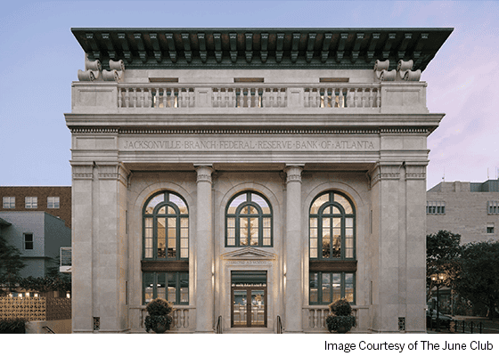 Recently featured in The Wall Street Journal’s story about the rise of private clubs, the June Club debuts in downtown Jacksonville with more than 450 members. New York-based design studio Ward + Gray was tapped to reimagine the landmarked Federal Reserve Bank Building as a homey manse with multiple areas for dining, meeting, socializing and entertainment along with outdoor seating and greenery. thejune.club
